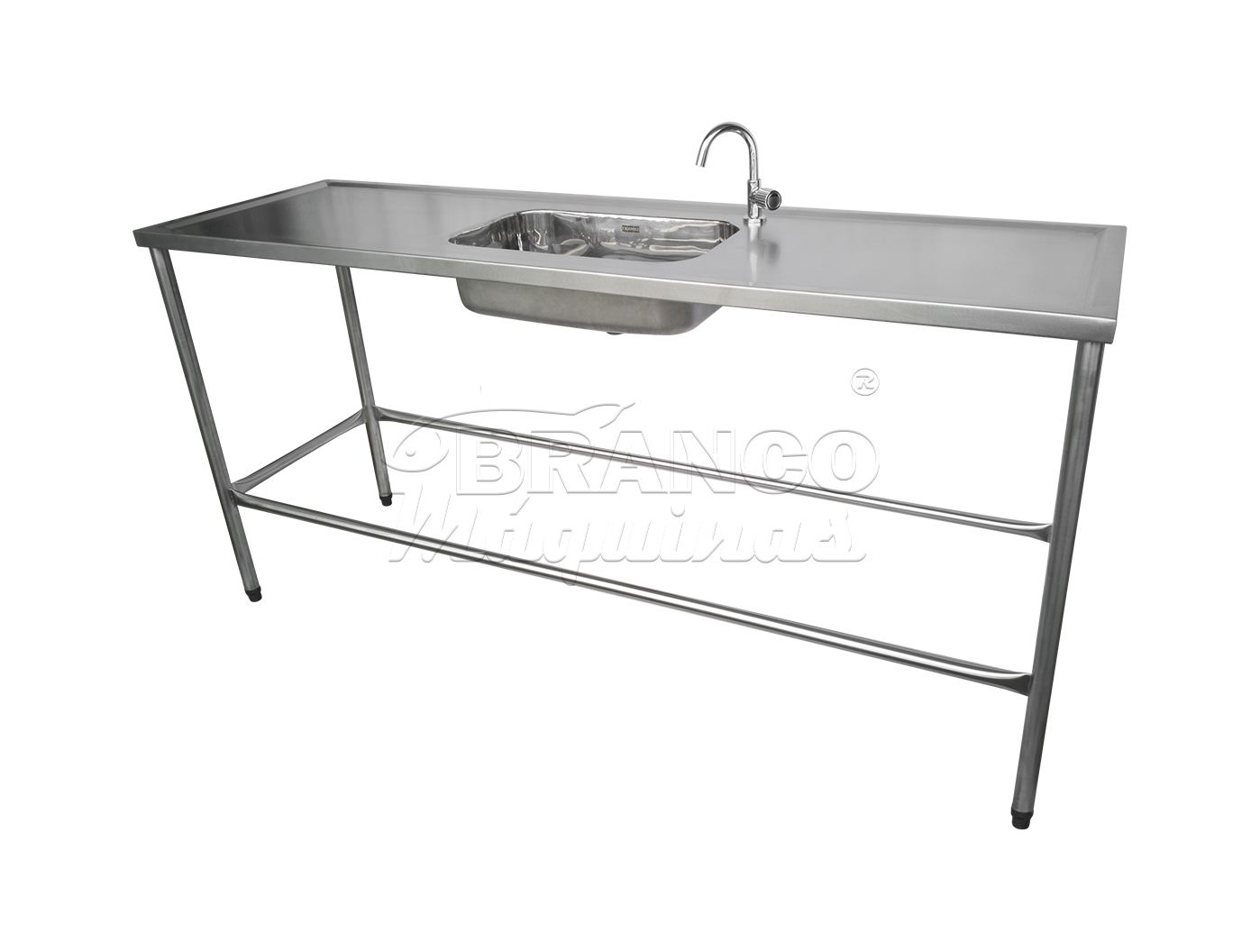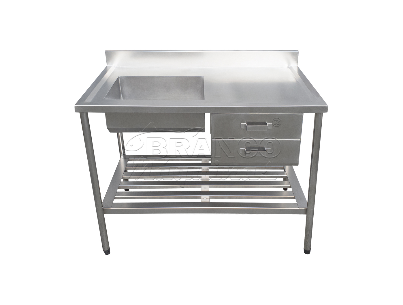 Mesa con Cuba, desarrollada para limpiar utensilios utilizados en procesamiento de pescado, perfil y base en placas plegadas de 1,2 mm y tubos con soporte de base de 38 y 25 mm. Recipiente de 250 x 400 x 500 mm. Válvula de acero inoxidable 3.1 / 2 x 1.1 / 2. Zapatos de altura regulable. Estructura de mesa en acero inoxidable AISI 304.