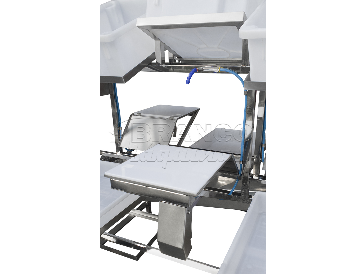 Mesa Fileteadora de Pescado, desarrollada para realizar cortes para eviscerado de pescado, perfil y base en placa de retención de agua plegada de 1,2 mm, con cavidad inclinada y tubo cuadrado de 30 x 30 mm. 04 Tableros de HDPE para cortes perfectos. Dispone de 04 boquillas con regulación y 04 válvulas de rodilla para actuación y control de agua. Canaleta central para realizar los cortes para su eliminación. Zapatas con ajuste y fijación regulables en altura, soportes superiores para 04 cajas de pescado a procesar, soportes inferiores para 04 cajas de pescado ya procesadas individualmente. Estructura de mesa en AISI 304 y HDPE.