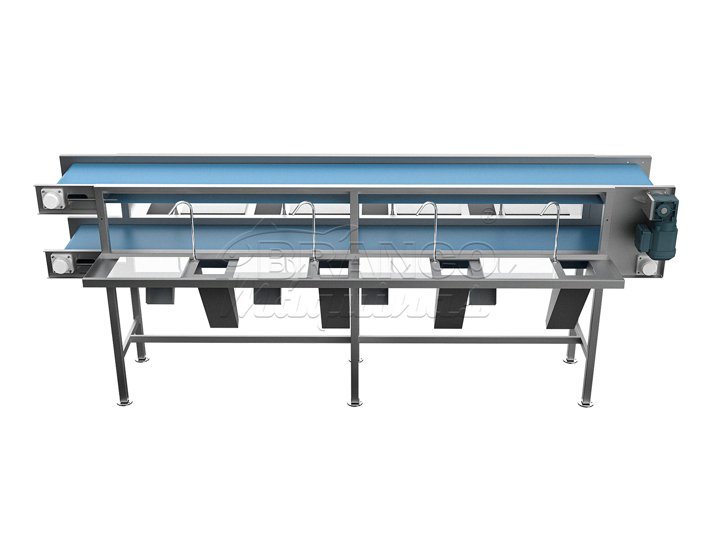 Cuadro con pulsadores electrónicos generales, emergencia y activación. Activación de motorreductores trifásicos, interruptor de arranque eléctrico. Motorreductores de la marca SEW. Zapatos con ajuste y fijación en altura regulable. Estructura de mesa AISI 304 - PU - HDPE.